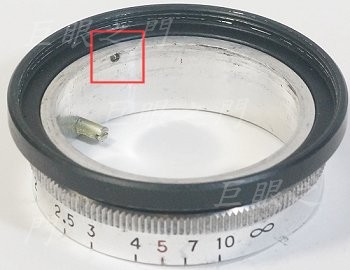 對焦的部分,紅框中是固定用的止付螺絲,但鬆了,所以整個對焦的環就掉下來。