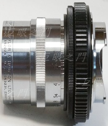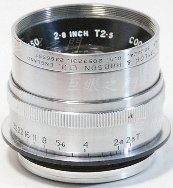 英國鏡頭,算起來焦距大約 71 mm 左右。這種標示 T 光圈的多半是電影鏡,查了網路的圖片,看起來原來應該是 C 接環的電影鏡。