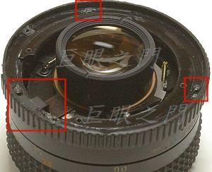 尾巴取下後的外觀,評估了一下,把 Nikon 接環貼著原來的鏡身裝上應該無限遠剛剛好,但是頂不到光圈環,光圈環左方本來鎖光圈連動裝置的位置有兩隻螺絲,凸出的程度剛好頂住 Nikon 的接環,但是另外的位置沒有螺絲,光圈環會晃動,於是在右方以及上方的紅框中各鎖了一隻螺絲,凸出的程度剛好頂住 Nikon F 接環,這樣光圈環就不會前後晃動了。