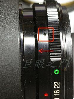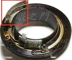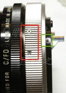 在光圈環的前方有個環,如紅色框中,在三個方向,共有三顆螺絲。轉鬆後,環可以向前移動。