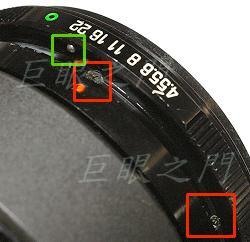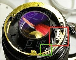 綠框中是光圈定位鋼珠,此鏡共有兩顆鋼珠,另一顆在相隔 180 度的方向。為何要有兩顆,研究一下發現位置剛好的錯開的,一邊是控制一級的光圈值,另一邊的則控制半級光圈值的定位。為何這麼麻煩,用一個不就夠了嘛。