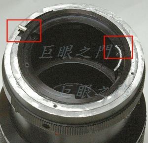 原來的光圈連動環還在,左方是連動環上卡住光圈環的凸起,右方有個缺口頂住末端被切斷而露鋁的光圈連桿。