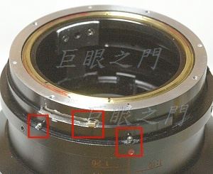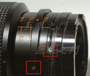 先來看看尾巴能否拆下,左方紅框中的止付螺絲鬆開就可以把光圈數值定位的環向左移動,露出來右方紅框中的螺絲,共有三隻,都拆開就可以把尾巴拆下來。