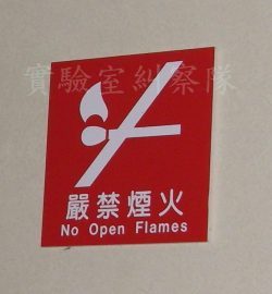 由進門開始,就應該有嚴禁煙火的標示,這個標示不只是給自己人看的,因為實驗室中可能有送貨的、維修的、參觀的等等,如果沒有標示,萬一出了問題,您自己要負責,但是如果有標示,可以提醒其他人員,如果沒有遵照標示而發生事故,沒有遵守標誌的人員是有責任的。