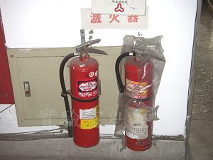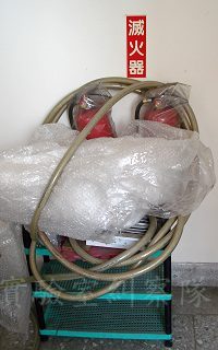 滅火器的塑膠套應該要拿掉,否則在緊急時也不易取用。更不應該放在電器開關箱的前面。
