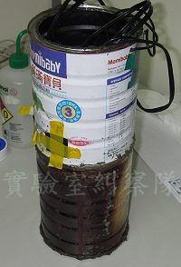 這是一個克難的自製加熱燈,但是下面一截已經烤成焦黑,有潛在的火災危險。