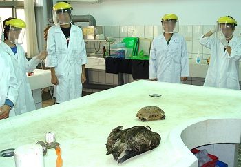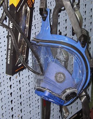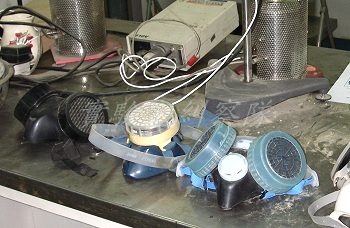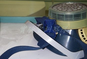 實驗室中至少要使用像這樣有濾毒罐的防護具,這張圖是做展示。實際上呼吸防護具不能這樣放。