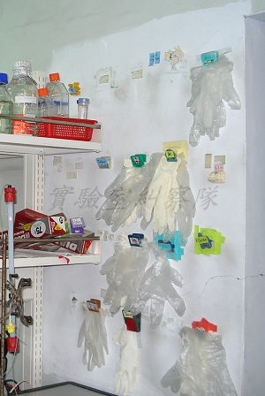 手套這樣掛著,目的是清洗後再使用。其實這種拋棄式手套不應該重複使用,除非是明確的有資料顯示所操作的實驗藥品完全不會穿透該手套材質,否則應該用完即丟棄。